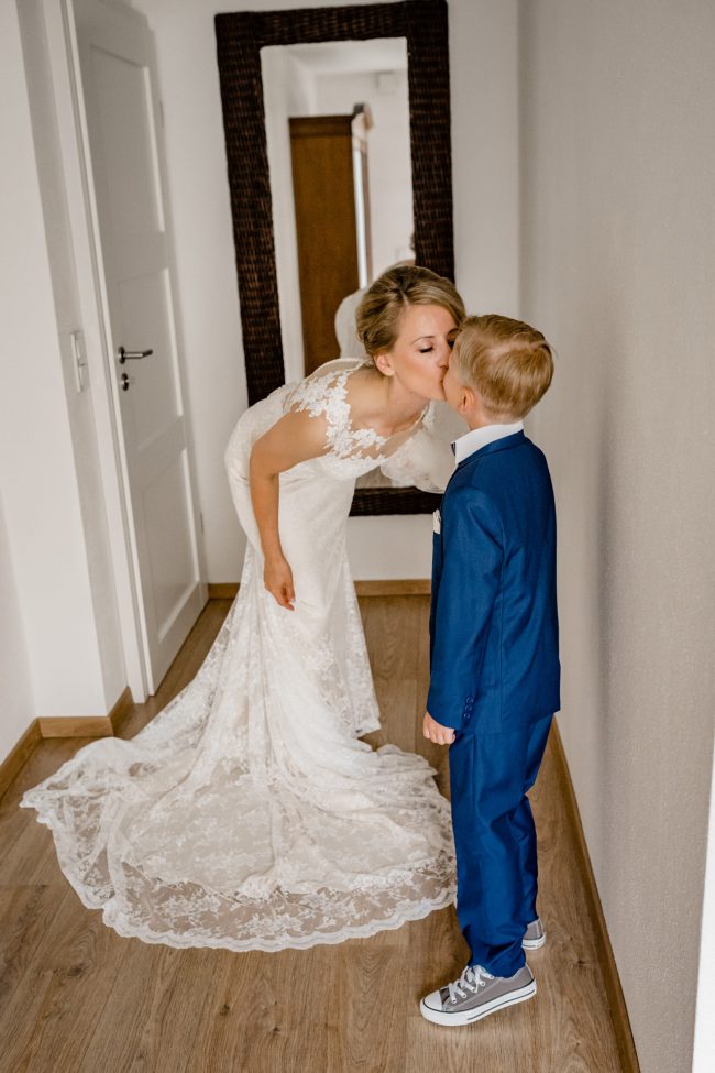 Von jeder Hochzeit bleibt mir immer ein ganz besonderer Moment im Kopf. Bei Jennifer und Christian war es der Augenblick, als der kleine Sohnemann seine Mama im Brautkleid das erste Mal gesehen hat. Er kam um die Ecke, stand mit großen Augen vor der Braut und war sichtlich gerührt. Als er dann noch sagte: “ Oh Mama, bist Du schön!“ kamen selbst mir die Tränen.